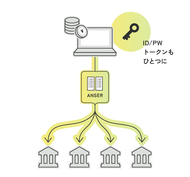 BizHawkEyeの画面から複数金融機関・口座にアクセス可能です。さまざまな金融機関の取引が一元管理できるだけでなく、煩わしいログインやトークンも1つにまとまります。