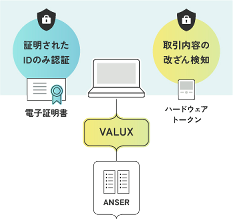 NTTデータが提供する金融機関取引用のセキュアな回線接続サービス「VALUX」を利用することで、VALUXが発行する電子証明書がインストールされたPCしかログインすることができません。