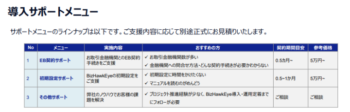 隅田氏によると、BizHawkEyeの導入に際しては、「初期設定サポート」として、サポート担当者がオンラインで接続して遠隔でテクニカルサポートなどを行うほか、電話によるサポートチャネルを用意している。