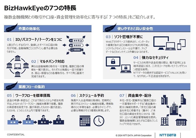 そのサービスが、NTTデータの「BizHawkEye」だ。同サービスは、NTTデータが提供するセキュアな回線サービス「VALUX」と組み合わせて利用するもので、PCに証明書をインストールし、Webブラウザから1つのIDとパスワードで複数の金融機関にログインし口座情報の一元管理ができる。