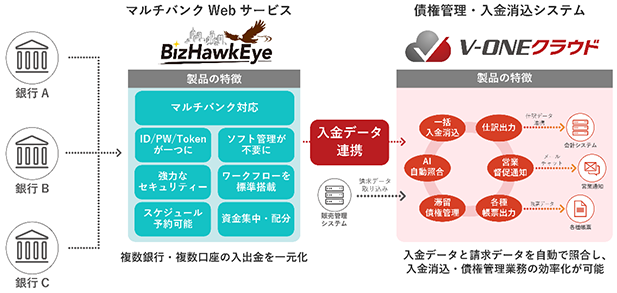 「BizHawkEye」にて取得した銀行振込の入金明細データを、株式会社アール・アンド・エー・シー様(以下、R&AC様)の入金消込・債権管理クラウド「V-ONEクラウド」へ連携が可能になりました。「BizHawkEye」と「V-ONEクラウド」がファイル連携することによって、金融機関毎の入金明細データ出力・加工などの作業工数を削減し、入金消込・債権管理業務の効率化を実現します。