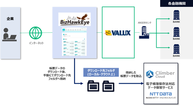 一例として、株式会社NTTデータビジネスブレインズのデータ保管サービス「ClimberCloud」をご活用いただくことで、BizHawkEyeで取得したデータを「ClimberCloud」で電子取引情報を保存することが可能になります。